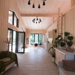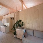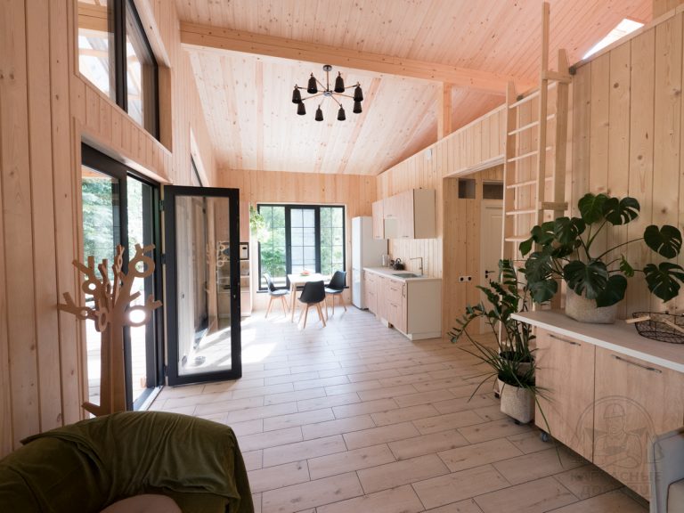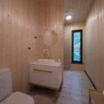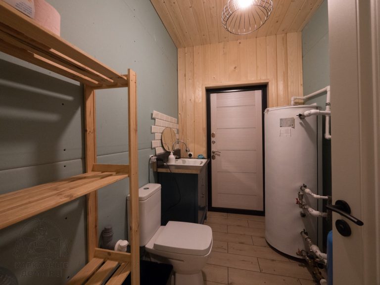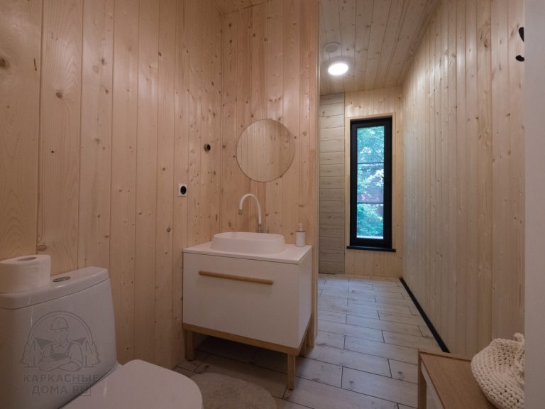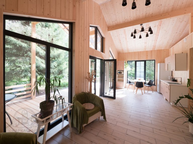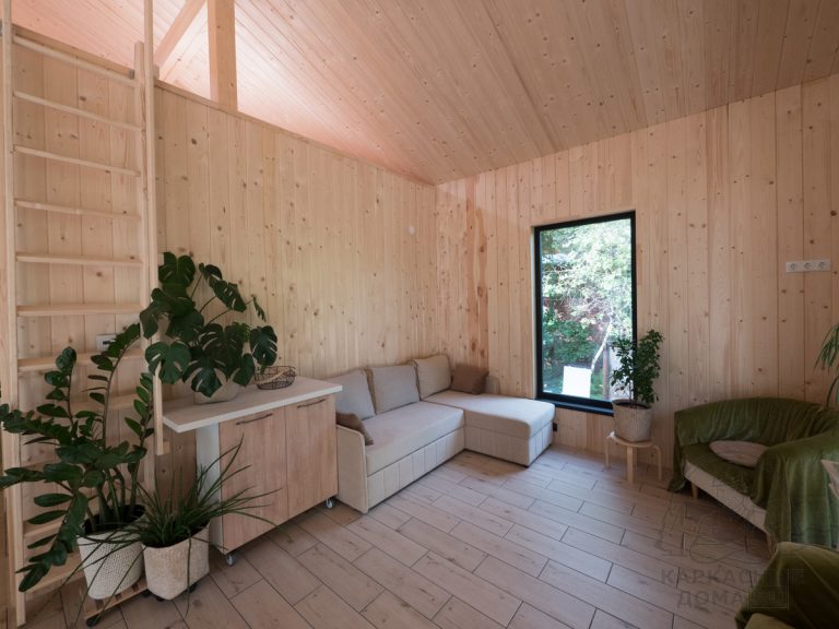 • Чистовой пол 1–го этажа и лофта. Пол первого этажа (во всех помещениях)- плиты ЦСП, толщиной 16 мм, Пол нежилой зоны лофта - обрешетка из доски камерной сушки, сечением 25х150 мм.