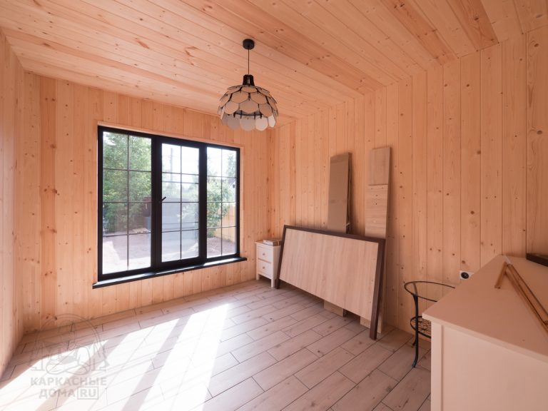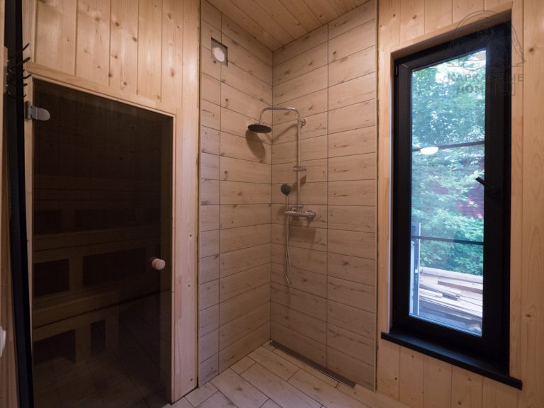 • Внутренняя отделка стен, перегородок и потолка. Имитация бруса камерной сушки, сорт А-В. В сауне-вагонка для саун (осина), камерной сушки