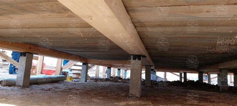 Пол - влагостойкие плиты «Quick Deck», шип-паз 16 мм. Под черновой пол выполнен монтаж оцинкованной, металлической сетки от грызунов.