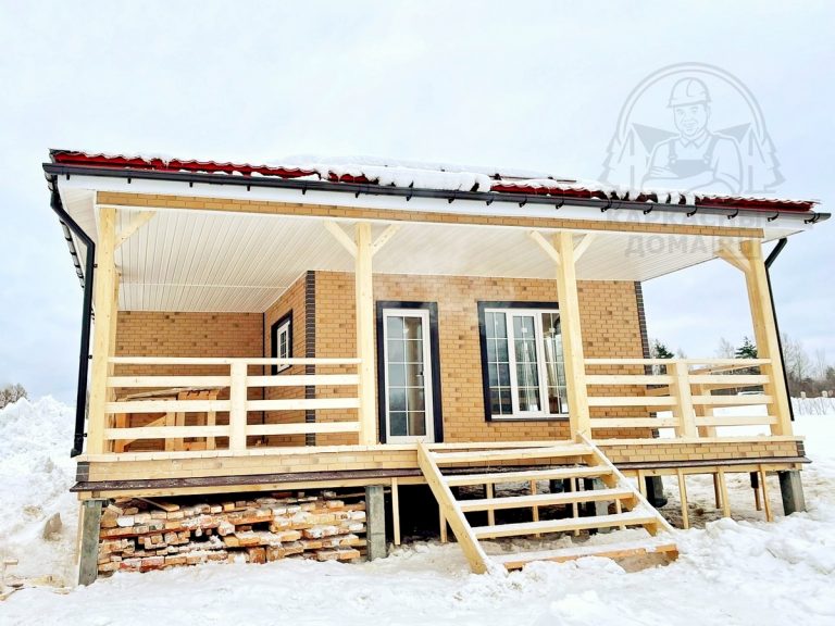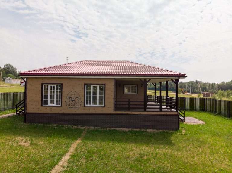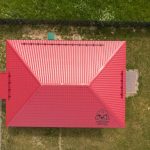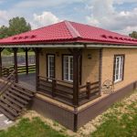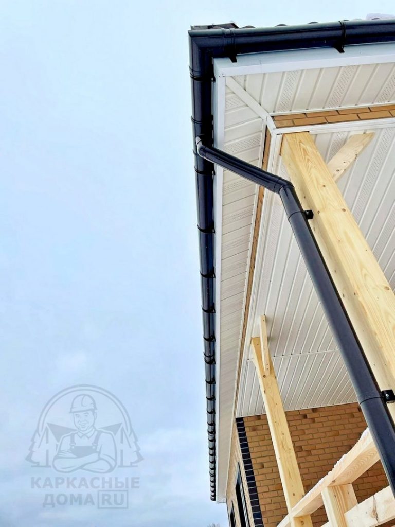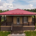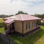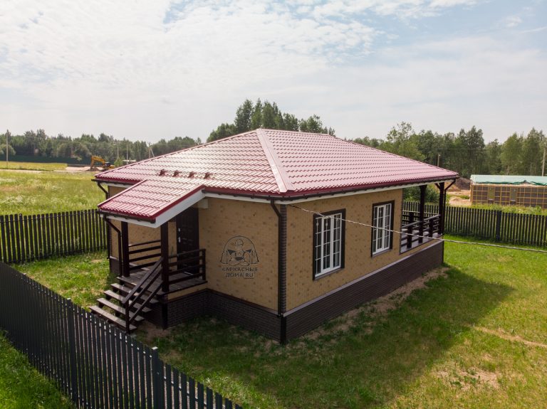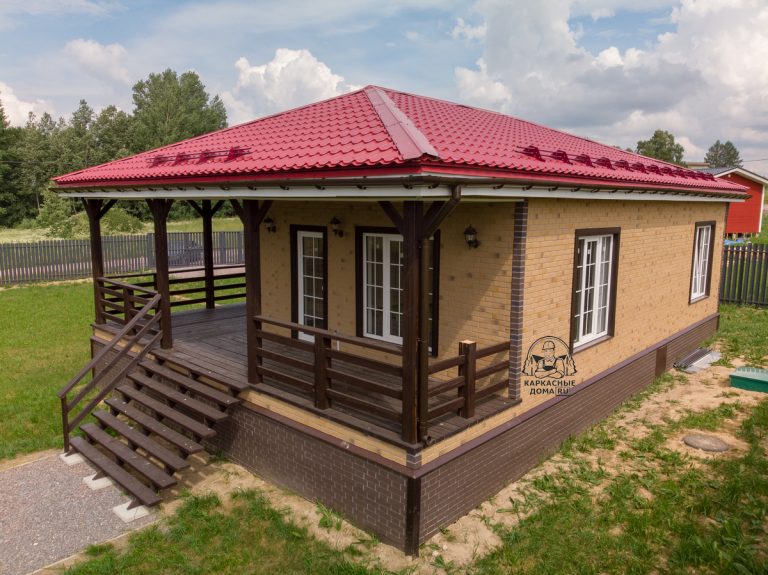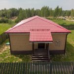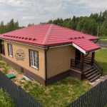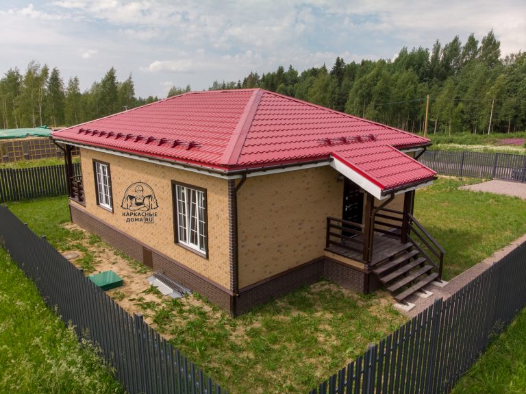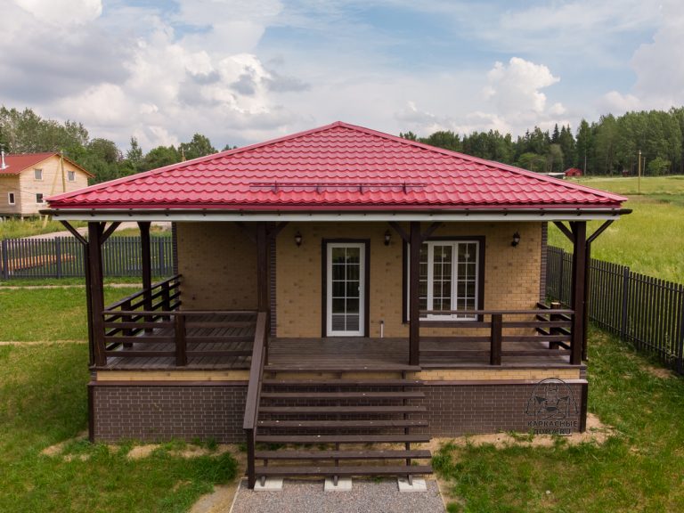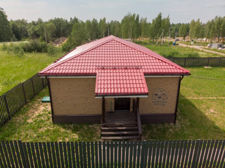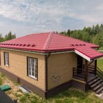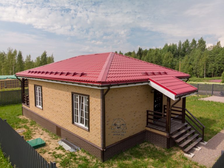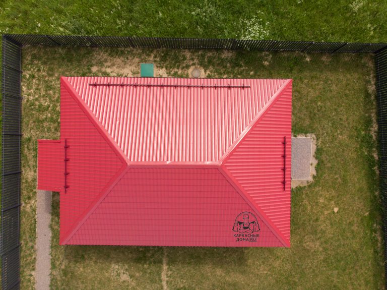 Крыша - деревянная, вальмовая. Материал кровли - металлочерепица "СуперМонтеррей", толщиной 0,45 мм, цвет- RAL 3011, цвет - красный, с доборными элементами (конек, карнизные, торцевые планки- цвета RAL 3011). Производство МеталлПрофиль. Свесы крыши подшиваются софитами "Docke" Premium T4 с центральной перфорацией, цвет - пломбир