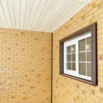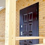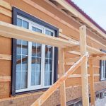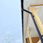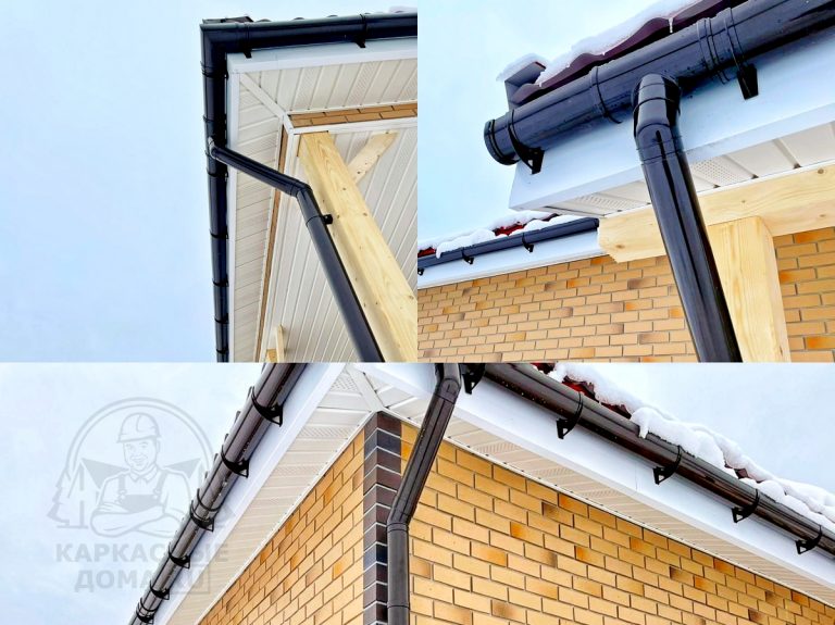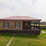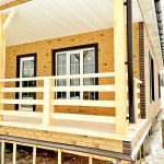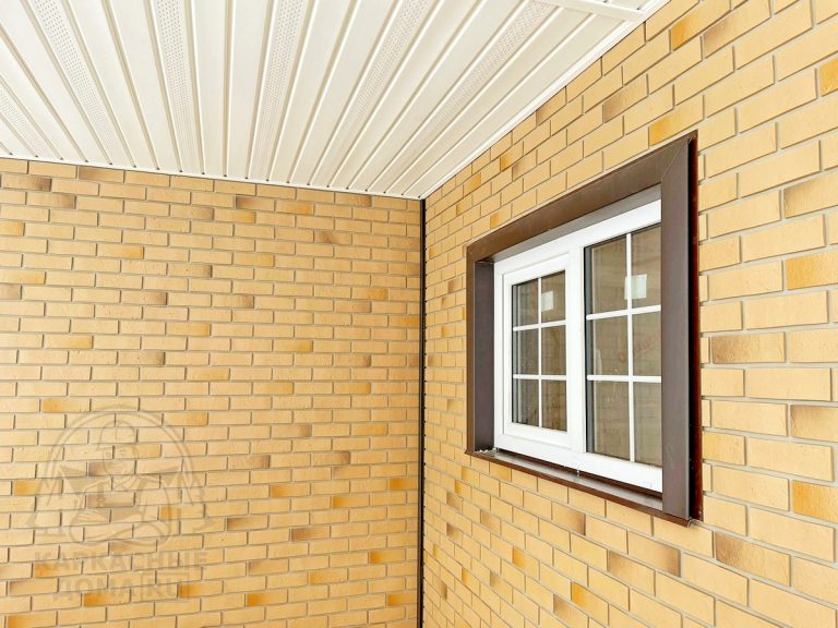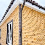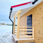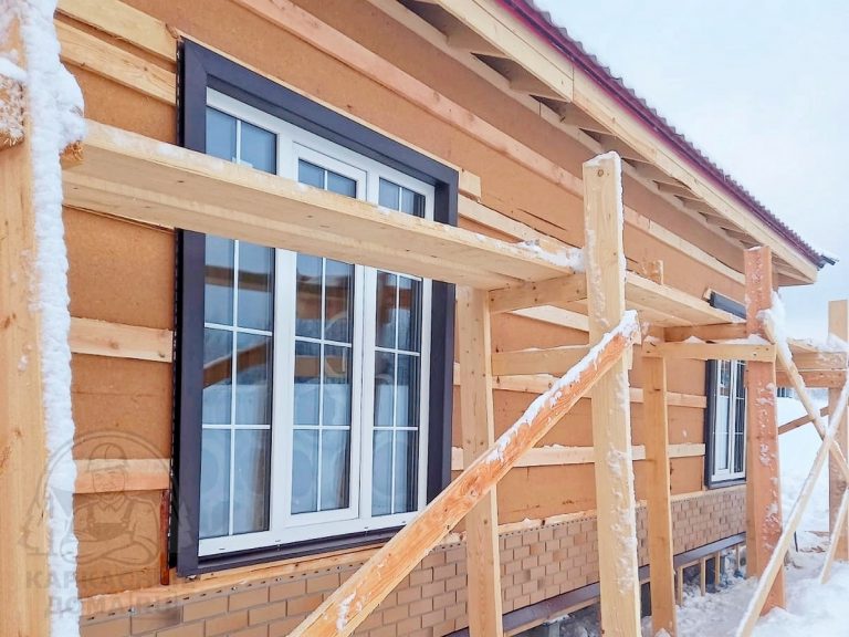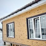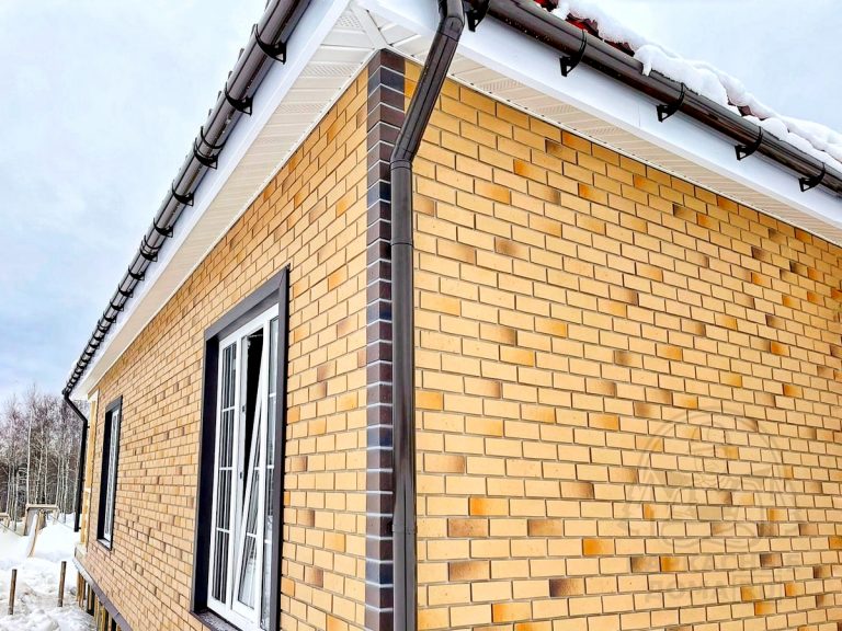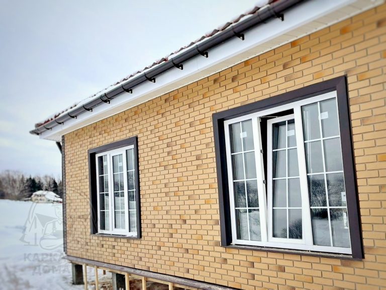 Наружная отделка - фасадные панели "Docke" Berg, золотой, углы дома "Docke" Berg, коричневый, околооконные и дверные профили коричневого цвета
