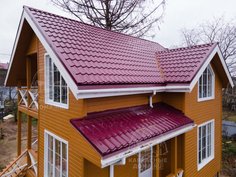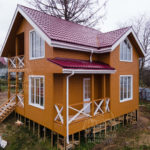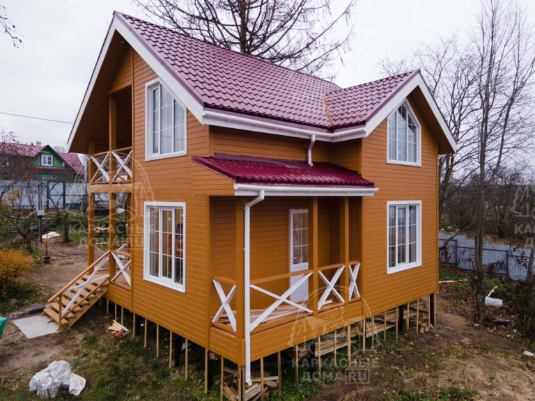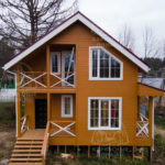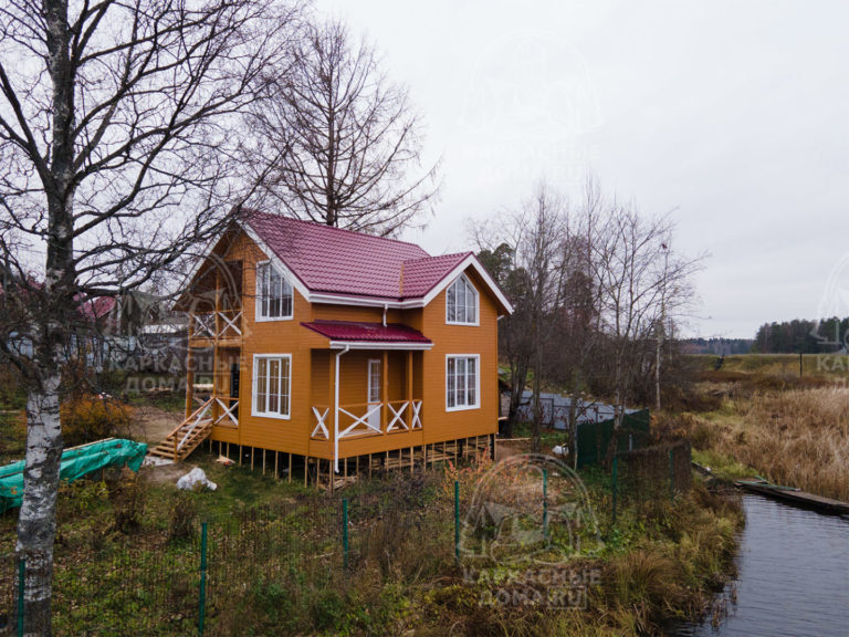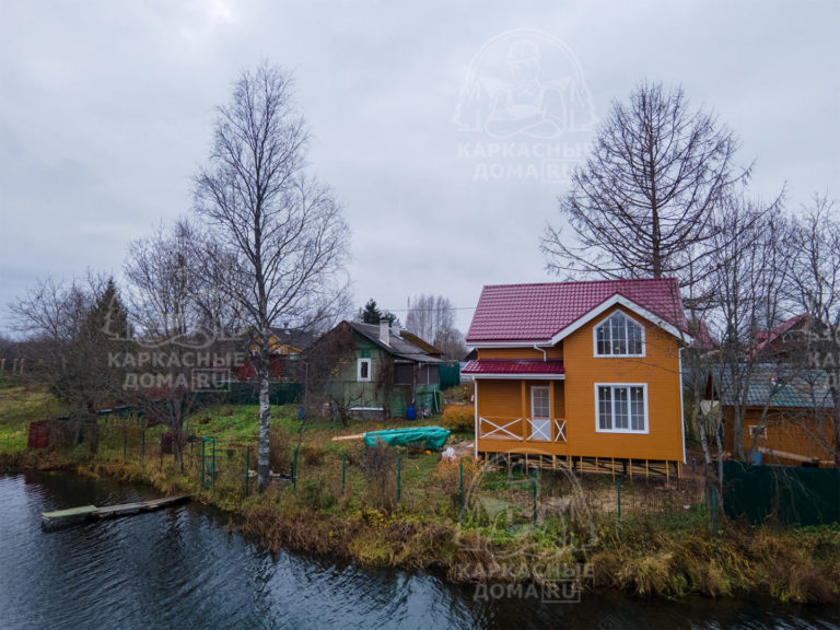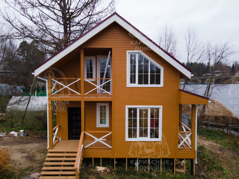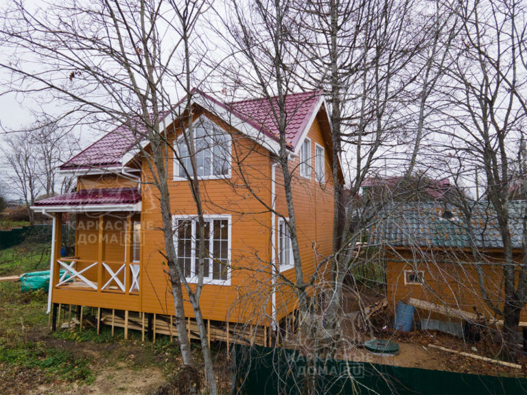 Каркасный полутораэтажный дом, для круглогодичного проживания, размером 8,0 х 8,0 м, со 128 м2. Имеет: 5 спален, 2 санузла, большую гостиную, 2 террасы, балкон, тамбур, 2 входа.
