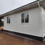 - Цоколь утеплен пенополистеролом «Пеноплекс», 50мм и зашит цокольными панелями ПВХфирмы «Дёке», серого цвета «под кирпич».
